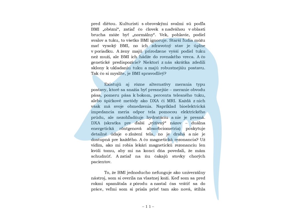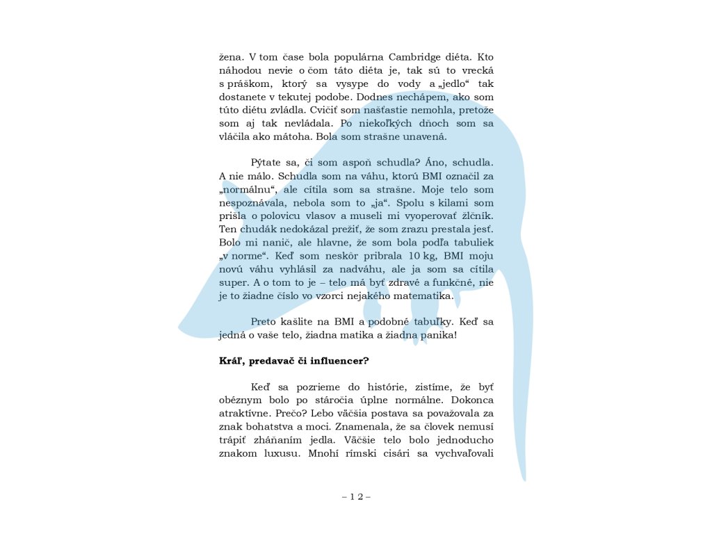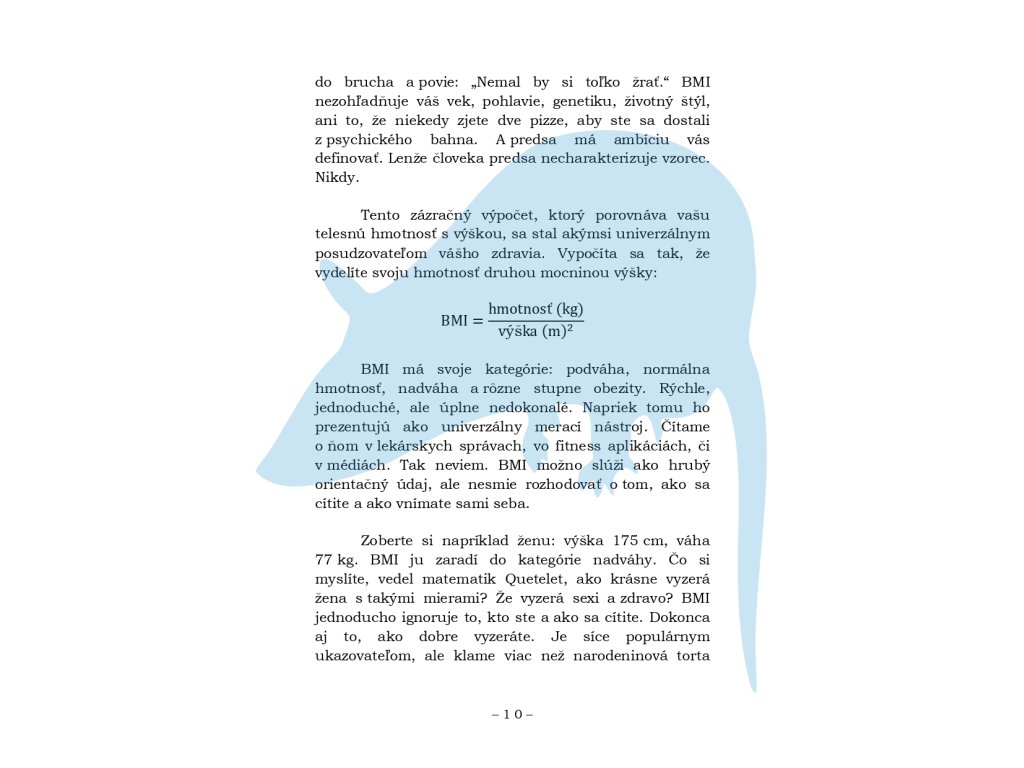 Táto kniha rozoberá obezitu bez prikrášľovania, predsudkov a zbytočných fráz o „pevnej vôli“. Dozviete sa, kto vymyslel BMI – a prečo je táto rovnica v praxi problematickejšia, než sa zdá. Pozrieme sa na skutočné príčiny obezity a na večnú dilemu, či sme obézni preto, že sme chorí, alebo chorí preto, že sme obézni. Kniha otvorene hovorí o tom, čo všetko sme ochotní obetovať pre ideál štíhlej postavy, prečo fitness centrum nie je jedinou ani povinnou formou pohybu a ako sociálne siete deformujú naše vnímanie tiel – vlastných aj cudzích.